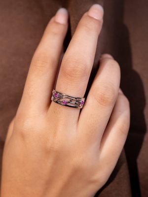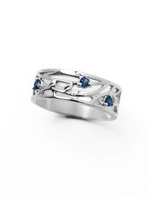 Filigree Friendship Band Ring in 92.5 Sterling Silver – Rhodium Finish with Blue or Pink Sapphire