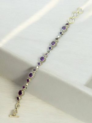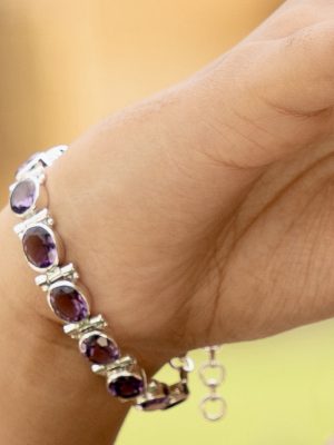 $199.00This elegant 92.5 sterling silver amethyst bracelet showcases a captivating row of oval-cut, rich purple amethyst gemstones, each meticulously bezel-set in handcrafted silver links. The… -