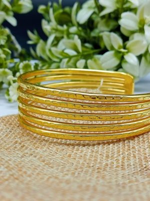 $69.00This gold-polished adjustable cuff, crafted in brass, features sleek circular bars for a refined yet bold statement. Designed for both elegant soirées and professional settings,… -
