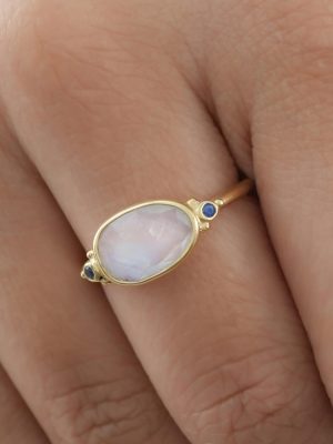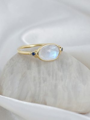 $149.00The Rainbow Moonstone Evil Eye Ring features a luminous Rainbow Moonstone at its center, flanked by two delicate sapphires on each side, forming a graceful… -