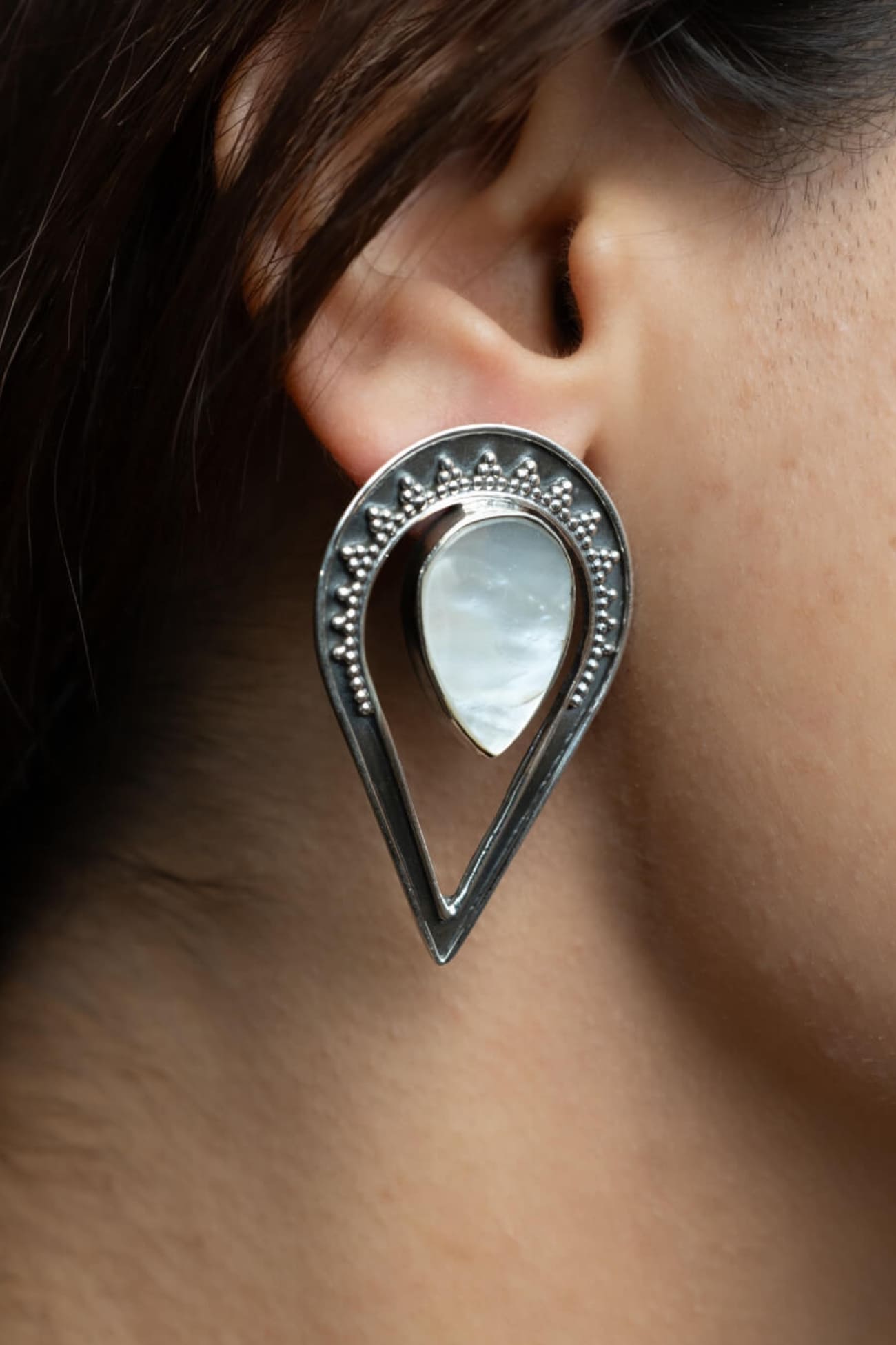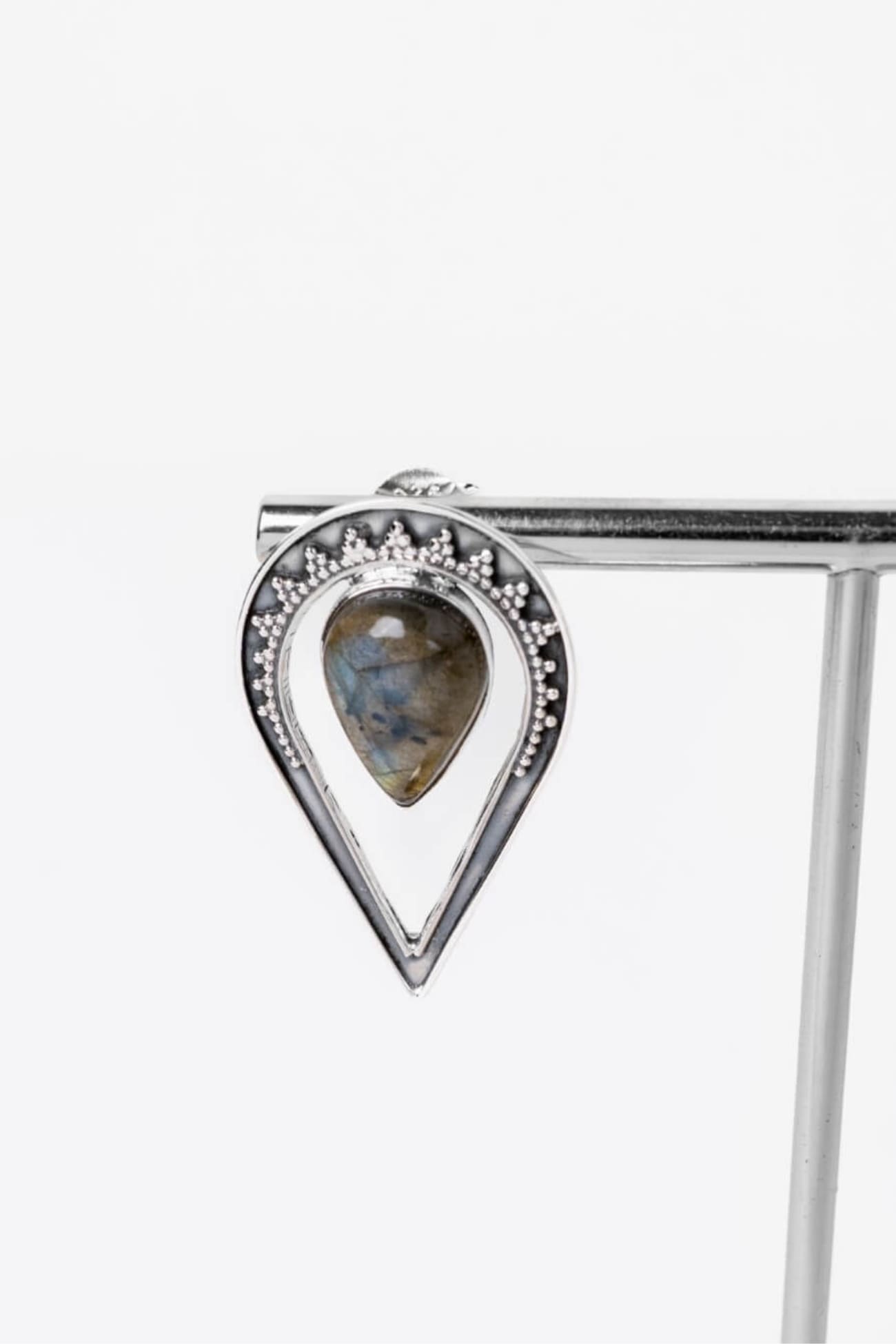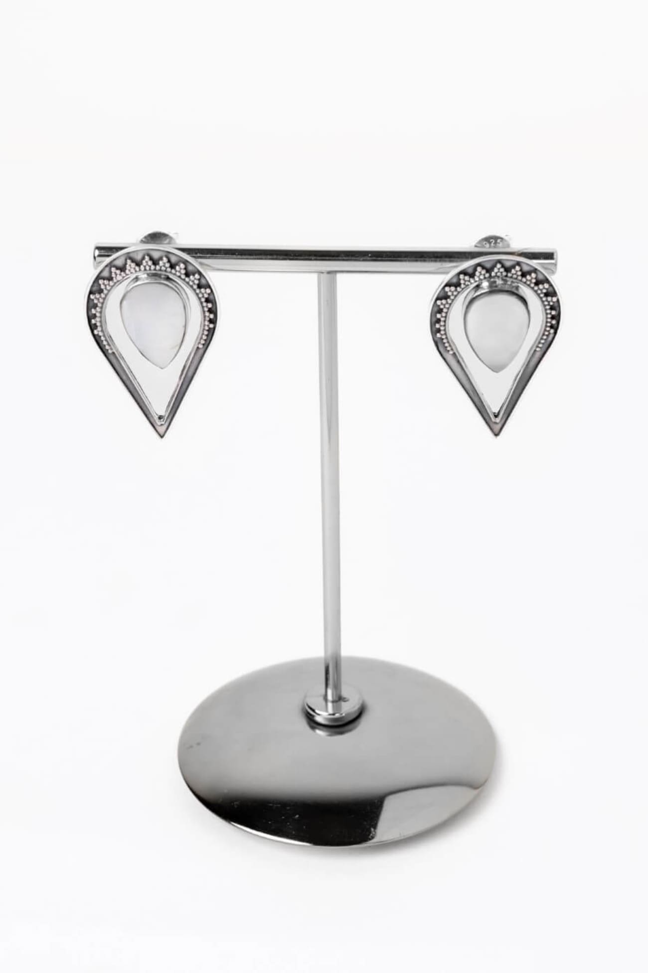 These beautifully handcrafted E-coated 92.5 sterling silver stud earrings are a signature piece, featuring intricate detailing along the border. Available in stunning Mother of Pearl (MOP) and striking Labradorite, each variant adds a unique charm. These timeless stud earrings elevate any look with their exquisite design, offering a touch of elegance and sophistication. Perfect for those who appreciate handcrafted jewelry and want to make a statement with natural gemstones.