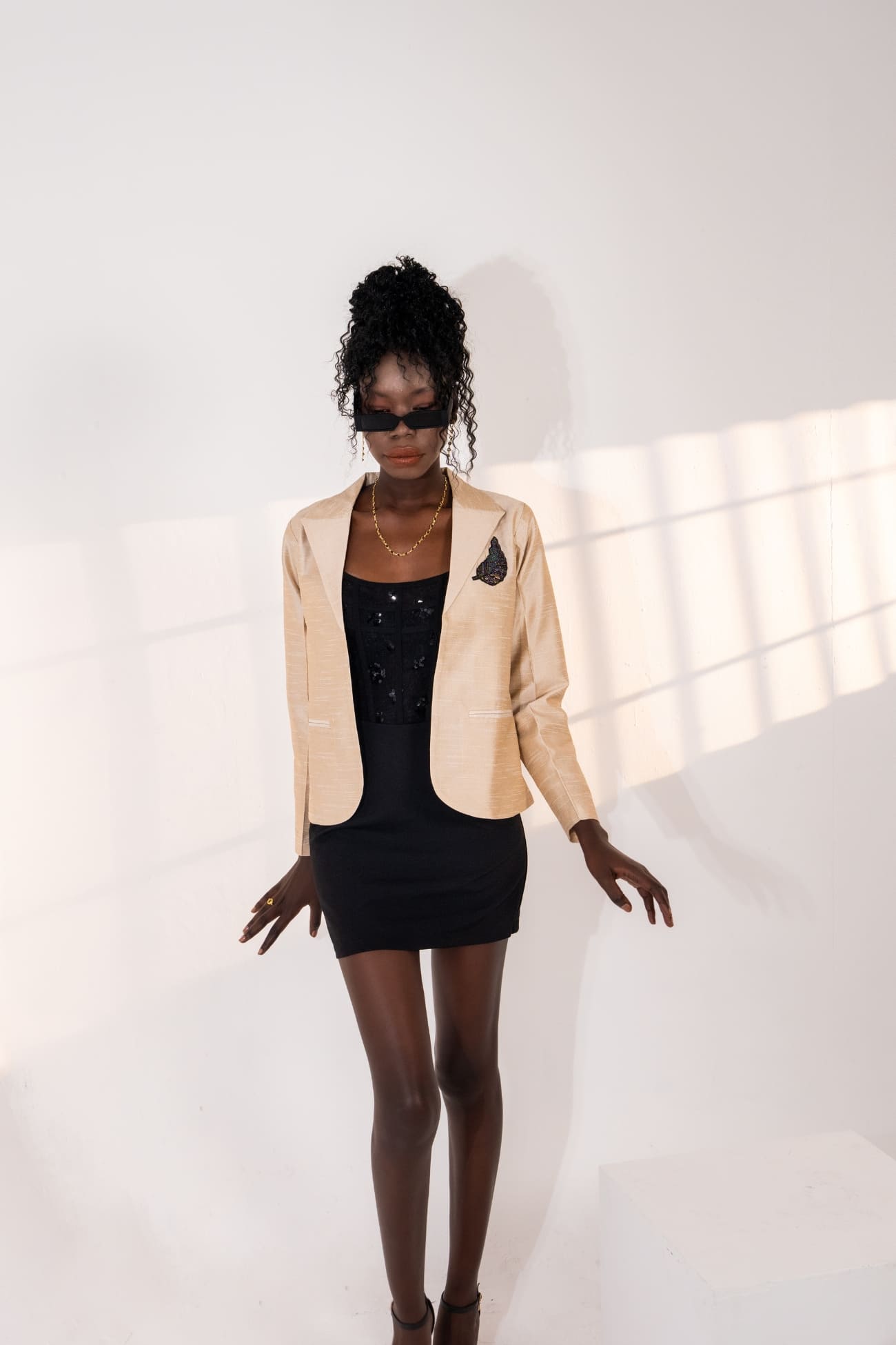 The Golden Embers Short Jacket captures the quiet luminosity of embers glowing at twilight — warm, elegant, and enduring. Crafted from golden raw silk, it exudes an understated opulence, brought to life through delicate bead-embroidered leaf motifs that echo nature’s refined beauty. The structured silhouette and short-sleeve design strike a perfect harmony between traditional artistry and modern sophistication.