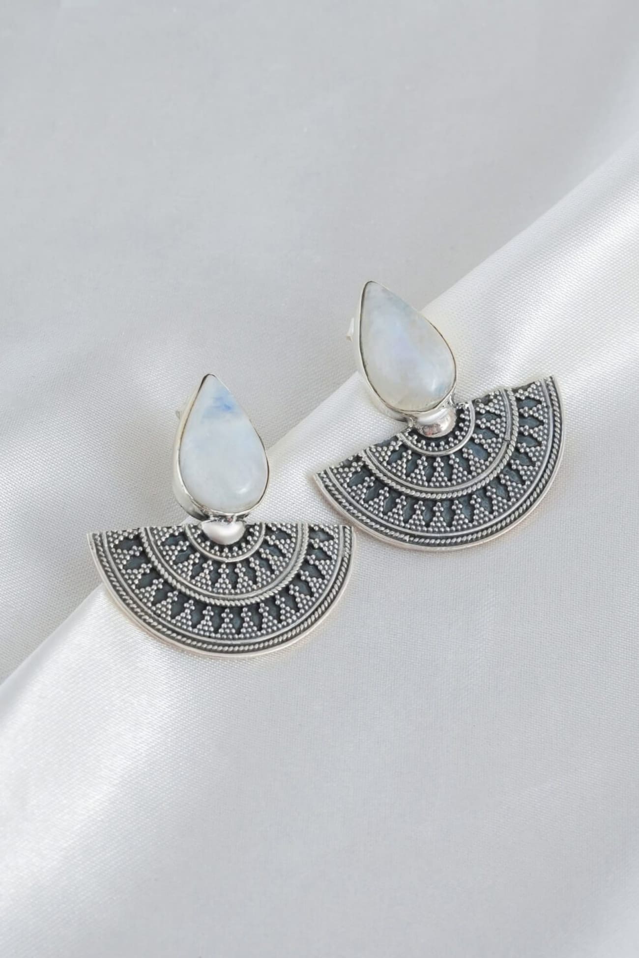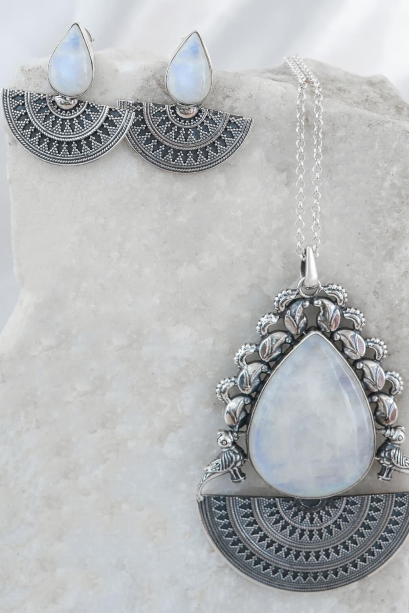 The signature earrings feature a stunning centerpiece, expertly crafted from a faceted Mother of Pearl gemstone. Handcrafted by our artisans, the intricate design is adorned with delicate peacock and floral motifs surrounding the centerpiece, reflecting exceptional artistry and elegance. Pair them with our matching pendant for a perfectly coordinated ensemble.