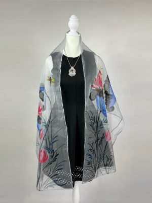 This gracefully designed kaftan, in cool hues and adorned with hand-painted peacock feathers, exudes an aura of serenity and style. Perfect for adding a touch of elegance to your wardrobe.