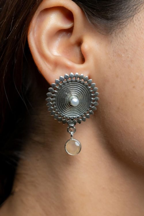 Elegantly designed for those who appreciate fine craftsmanship, these teardrop stone dangler earrings in 92.5 sterling silver feature a stunning gemstone drop suspended from a delicately handcrafted circular disc. The disc is adorned with an intricate motif, lending a timeless, artisanal charm to the piece.