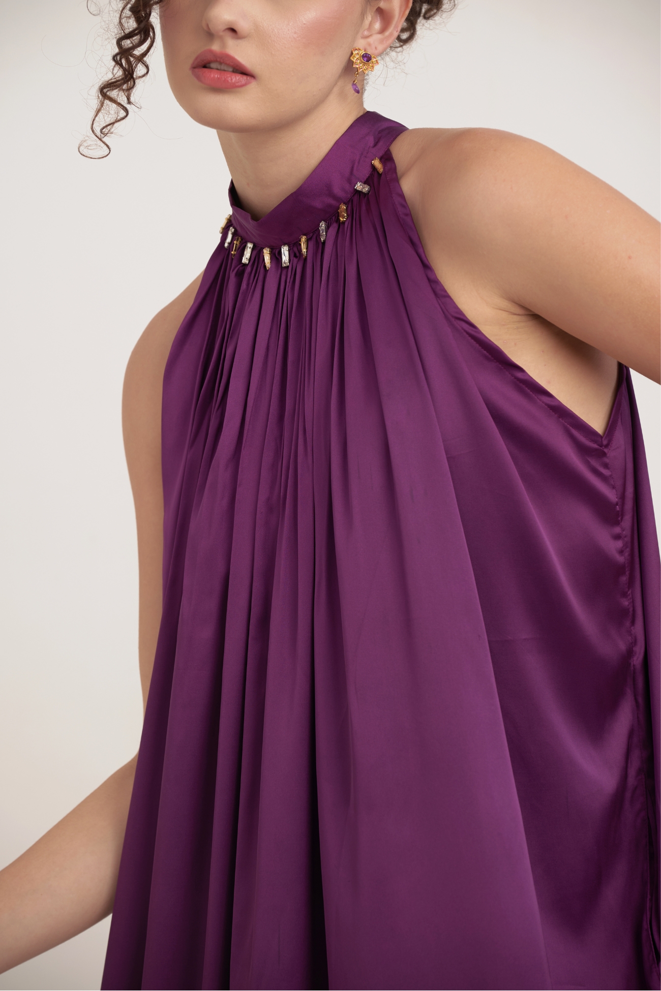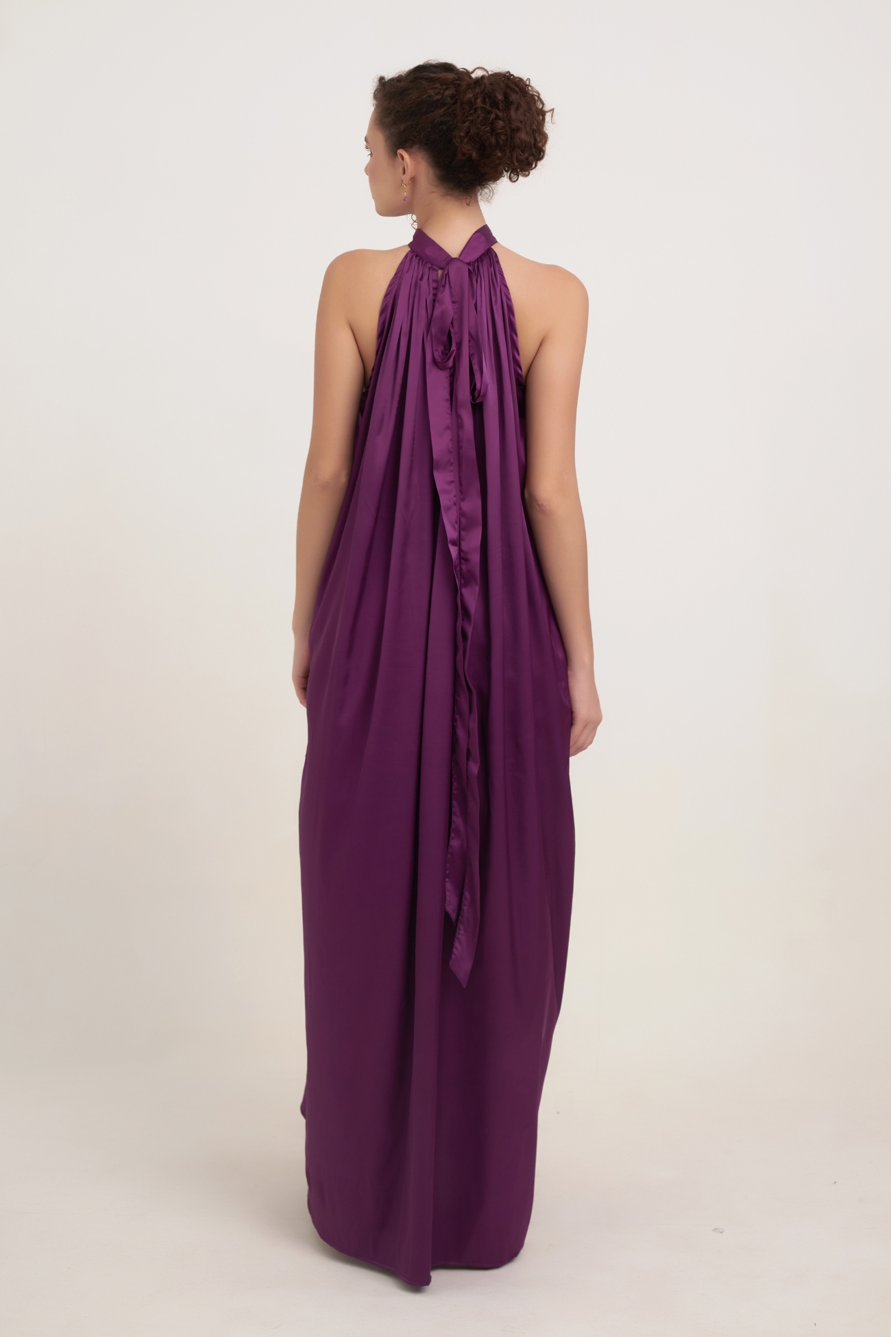 Embrace spiritual elegance with The Plum Lotus Gown, a true masterpiece of wearable art. Crafted from luminous satin silk in a regal Plum Purple, this gown features a dramatic, flowing silhouette that exudes quiet luxury.