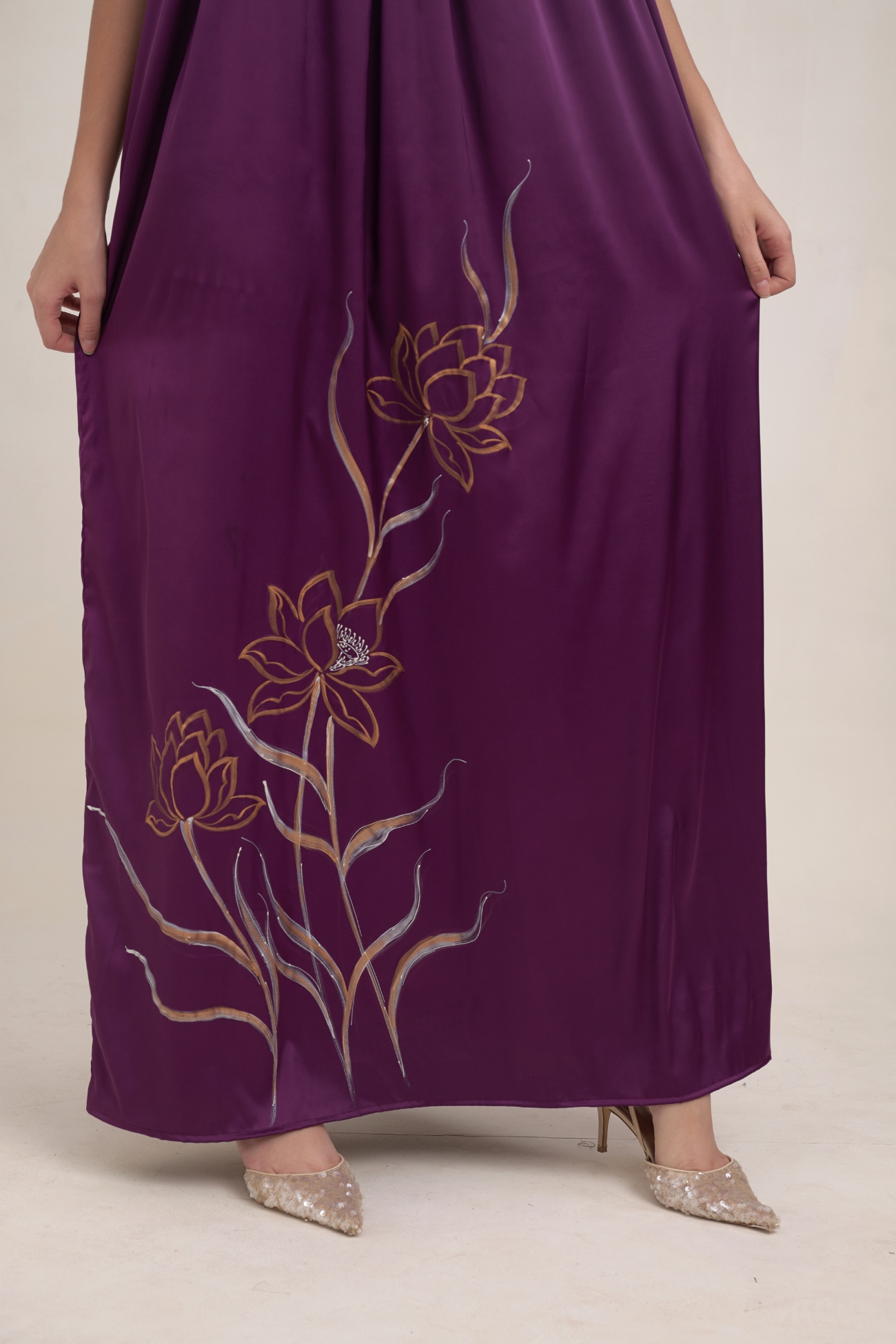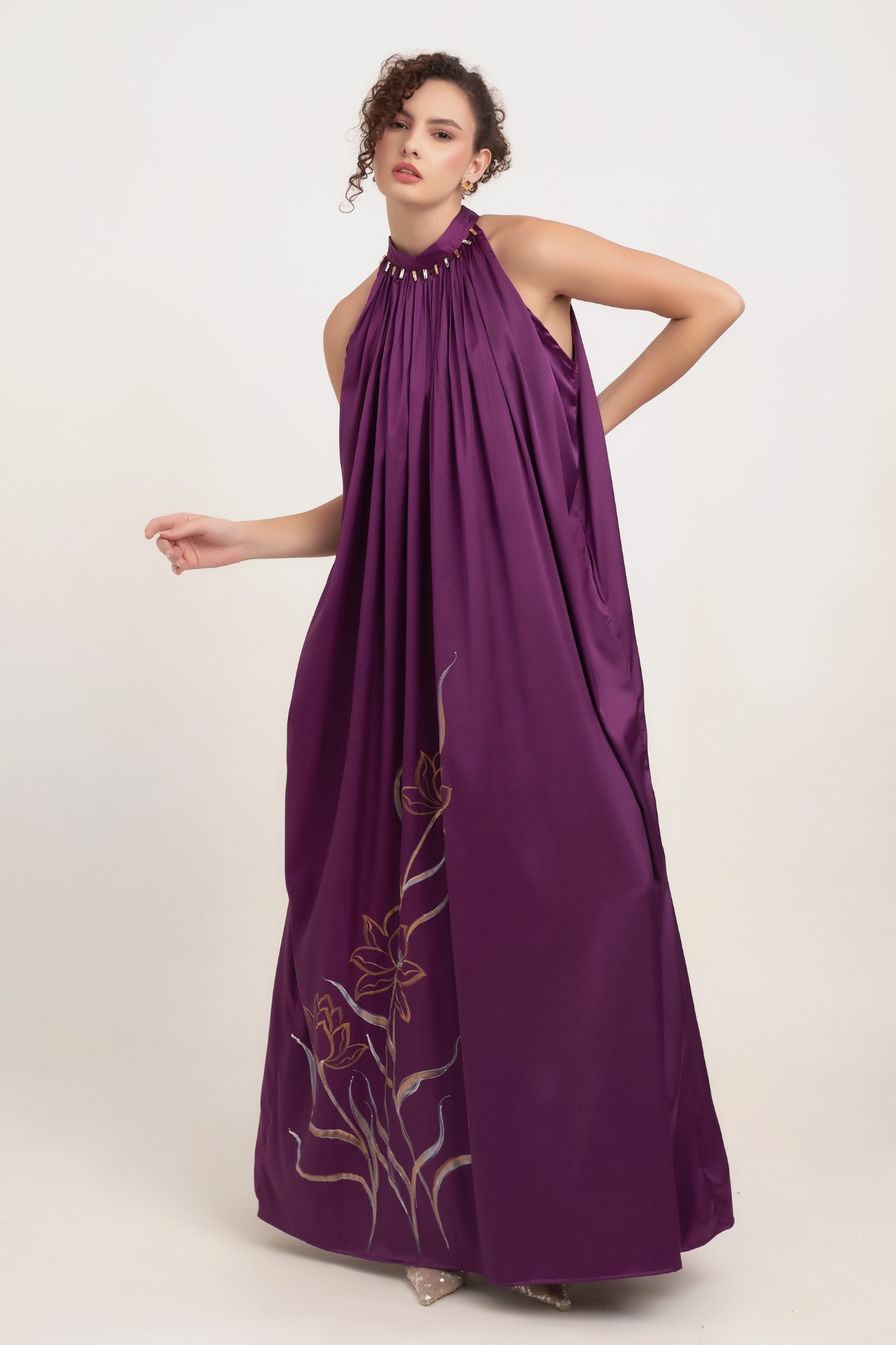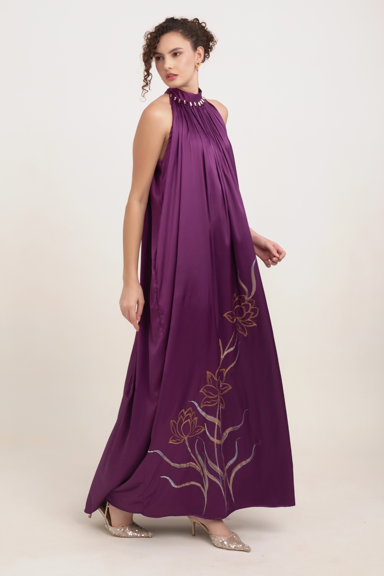 The centerpiece is the meticulous hand-painting of Lotus Flowers and intertwining stems, executed in shimmering gold and silver pigments. The Lotus symbolizes purity, rebirth, and tranquility, making this dress an icon of profound inner beauty. The gathered halter neck is finished with a stunning row of rectangular gold and silver-toned crystal bars, adding a structured, regal element before the long silk string ties at the back. This piece depicts Deep Intuition and Wisdom, perfect for occasions demanding refined presence.