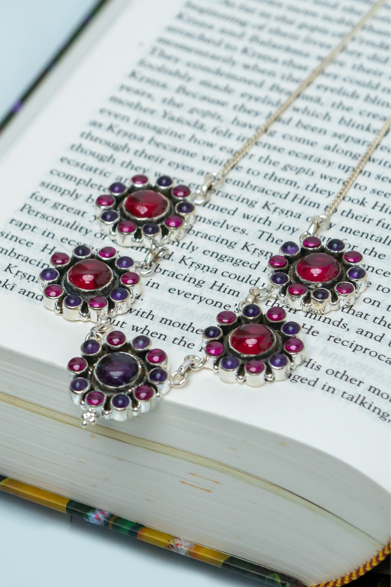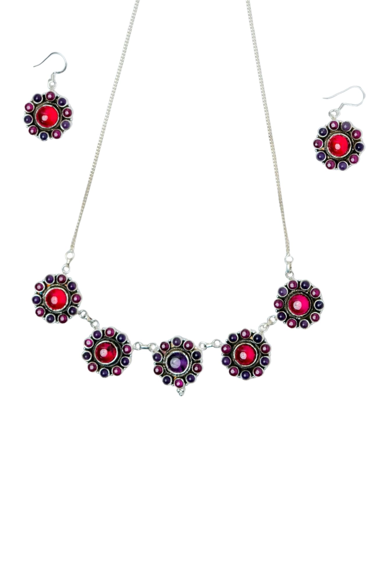 Inspired by the Victorian era this beautiful neckpiece with earrings with center pieces of glass Amethyst and glass ruby recapitulates the stories of royalty.