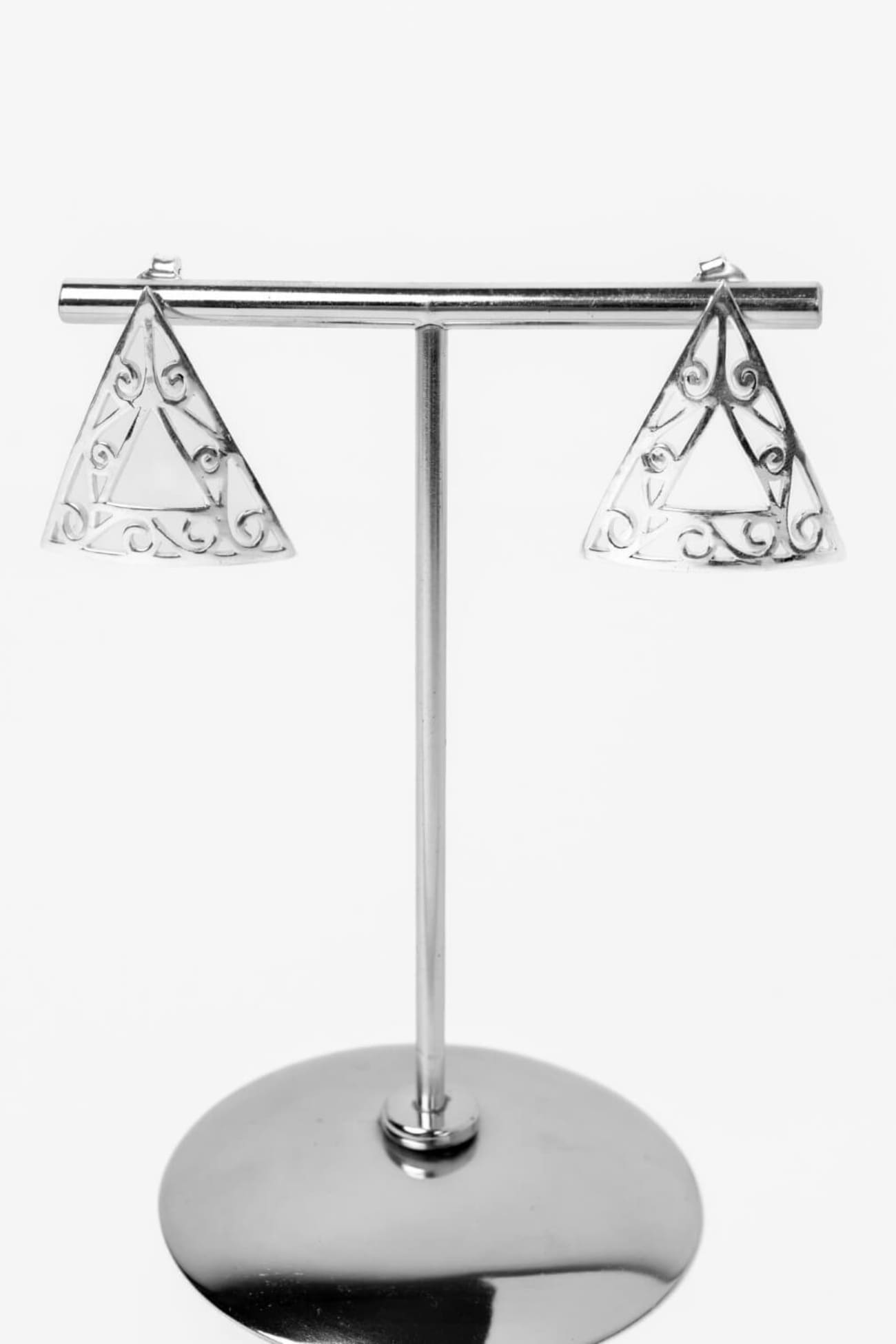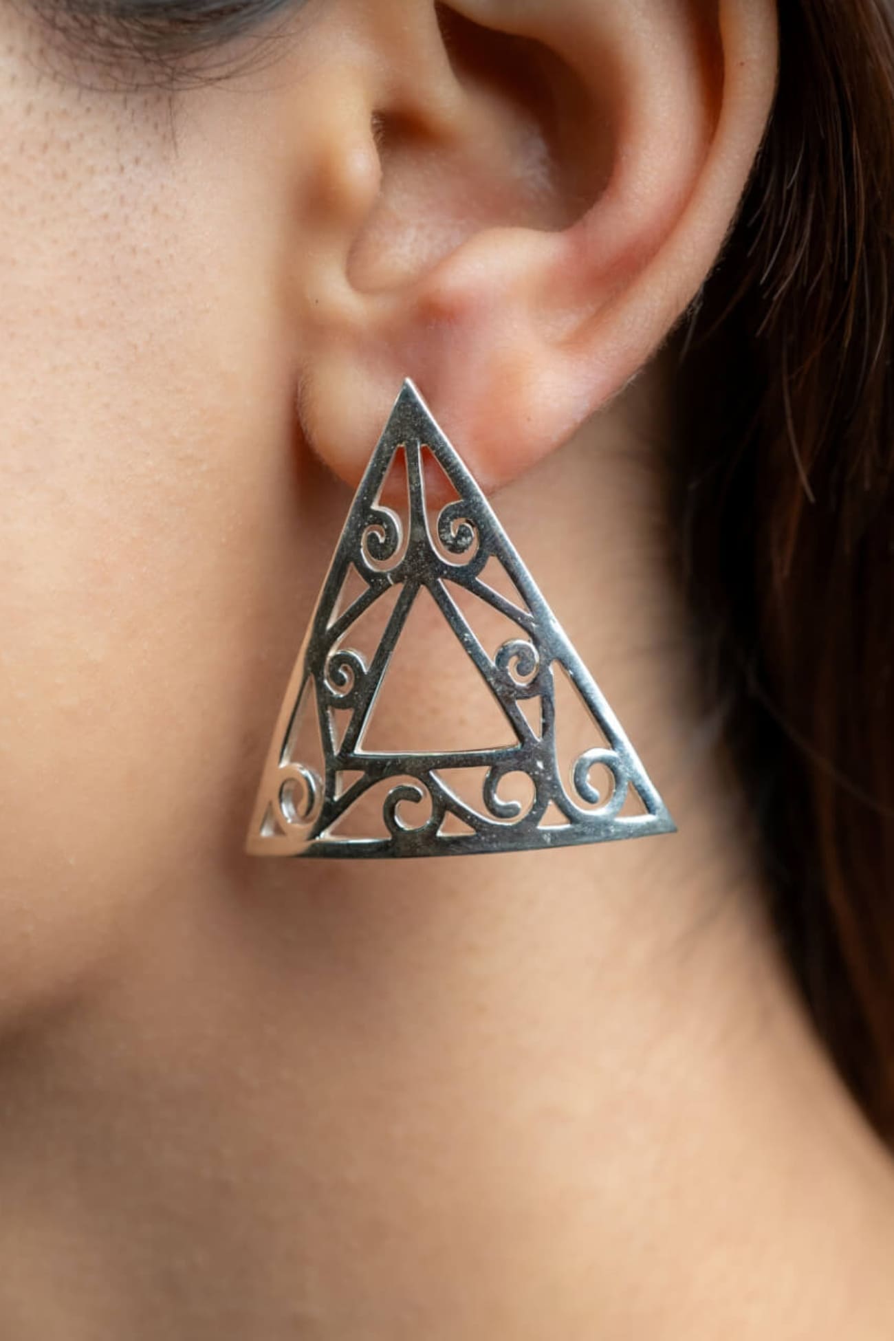 These striking triangular stud earrings, featuring intricate vine motifs along the edges, are handcrafted with precision by our skilled artisans. The unique design blends artistic charm with modern style, making them perfect for a cocktail party, office events, or casual office wear. Crafted with attention to detail, these handmade sterling silver earrings add a sophisticated and unique touch to any outfit. With their versatile and elegant design, they’re an ideal choice for those seeking artistic jewelry that stands out with subtle elegance and style. Perfect for anyone looking to add modern jewelry with a nature-inspired design to their collection.