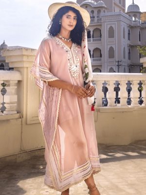 Handcrafted Powder Pink Organza Silk Kaftan Dress – Mirror Work & Pearl Detailing